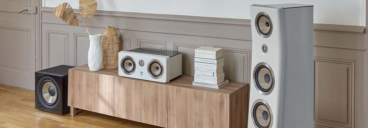 Our engineers have revisited their choice of ‘Focus Time’, which corrects speaker alignment, making them the same distance from the ear. The cabinet is made in one-piece integrally moulded wood. The Zamac base also brings out masses of character. With its spikes and cups, the base provides great stability from a very small footprint. Final details: the glass-covered top and magnetic grilles. When these are removed, they reveal the speakers’ flax cones, the final design touch that gives Kanta its unique look.