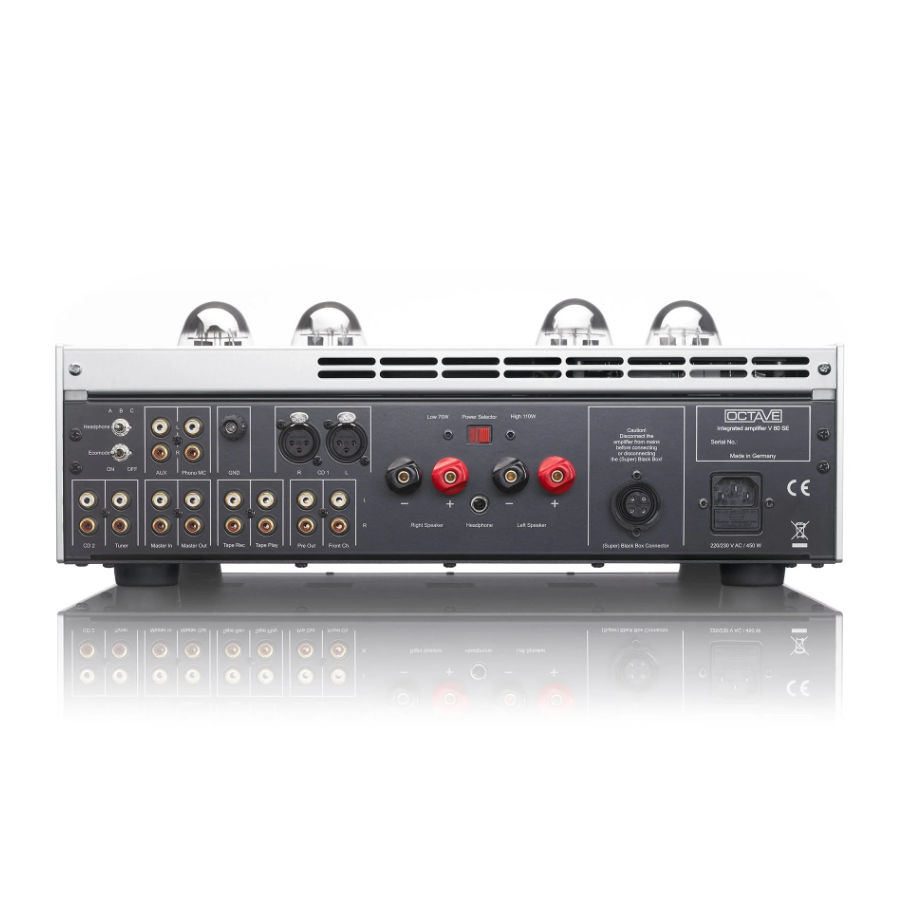 As a serious alternative to high end separate pre- and power-amplifier components, the V 80 SE is equipped with a wide variety of inputs, both RCA and XLR, and features full function preamp capabilities. A MM or MC phono board is optional. A connection for Octave’s proprietary Black Box or Super Black Box power supply capacitance upgrade module is also included.