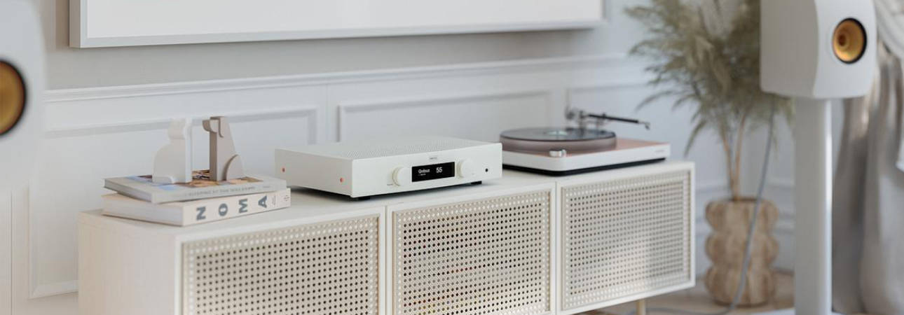 While the H150 is a full-width amplifier designed to match standard hi-fi components, its depth of just 35 cm makes it easy to place on or into most shelves and media cabinets. Available in both black and white, the H150‘s clean, understated design complements any interior. Its robust construction includes a thick, precision-milled aluminum front panel and control knobs, with a steel top cover perforated with heat vents, adding to its compact, modern look. A central OLED display provides clear readouts from a distance and can be dimmed or turned off entirely to suit your environment.