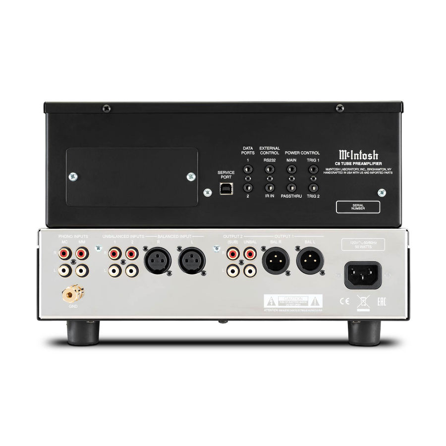 For personal listening, the C8 comes with our High Drive headphone amplifier that has plenty of power and flexibility to drive a wide range of headphones. Power Control ports allow for easy system power up and shutdown by sending power on/off signals to other connected McIntosh components. The user selectable Auto Off feature will turn the C8 off after 30 minutes when there’s been no user input or if no audio signal has been detected. Home Theater Pass Through allows the C8 to be seamlessly integrated into your home theater system, and Data Ports can send remote control commands to connected source components.