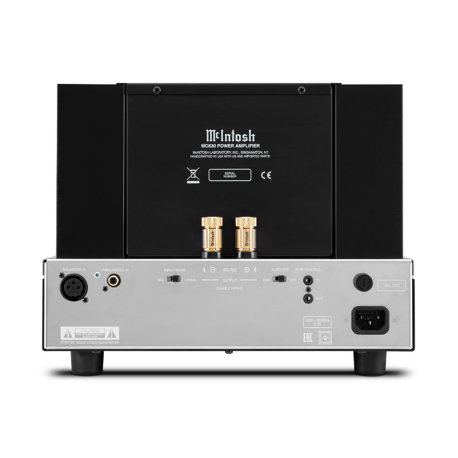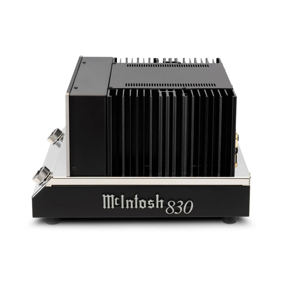 A die cast aluminum name badge is affixed to each side of the chassis, and the front, top and rear of the chassis is polished to a mirror finish. The MC830 features a black glass front panel with silver trim, a blue Watt meter, an illuminated logo, and control knobs.