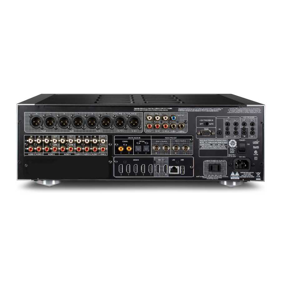The latest HDMI features, including HDCP 2.2, 4:4:4 color resolution, High Dynamic Range video support, and CEC/ARC, are all included. Digital inputs and outputs are available in both coaxial and optical formats to make it easy to attach all your digital sources. With BluOS® we have also made it easy to add more speakers for listening to music in additional rooms. IR repeaters, 12V triggers to automatically switch amplifiers on and off, and an RS-232 data port makes it easy to connect to highly advanced automated control systems, such as Crestron and Control4. Thoughtful features like discrete On and Off codes, direct access to inputs and FM station presets facilitates the integration of the M17 V2i into elaborate remote control systems.