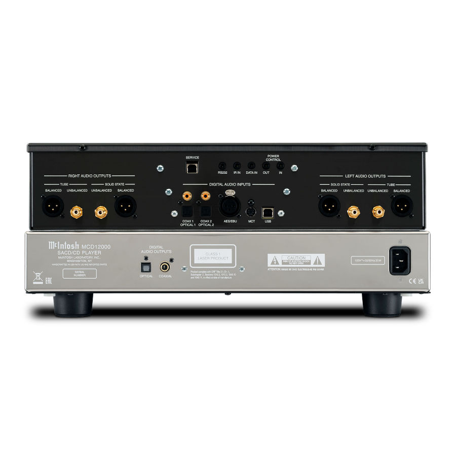 All outputs are driven by discrete amplifiers or a blend of vacuum tubes and discrete amplifiers. For vacuum tube output, one 12AT7 tube and one 12AX7A tube are assigned to each the left and right audio channel. Solid state output is via a discrete balanced op-amp. A digital coax and optical output are included for added flexibility to connect the MCD12000 to the rest of your home audio system.
