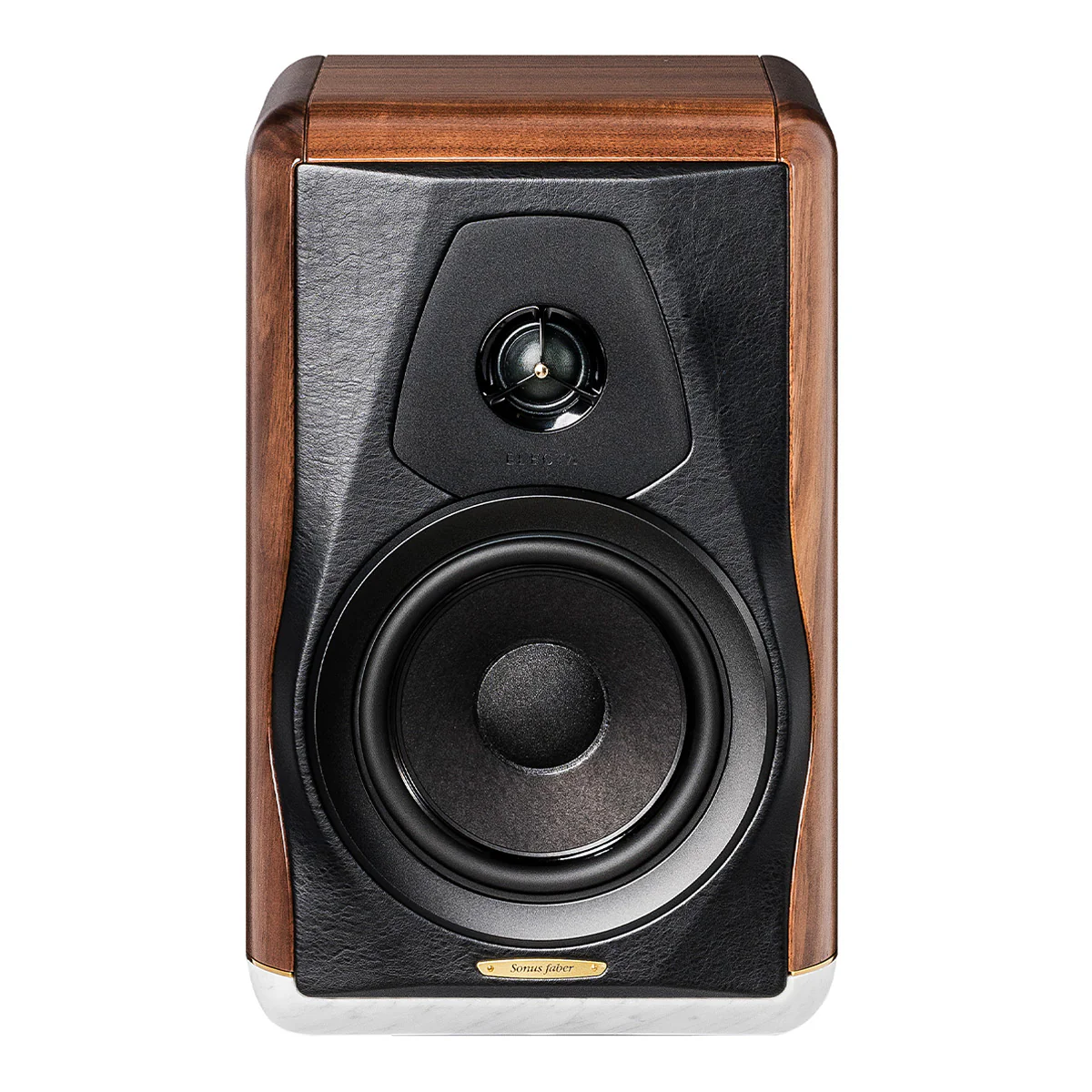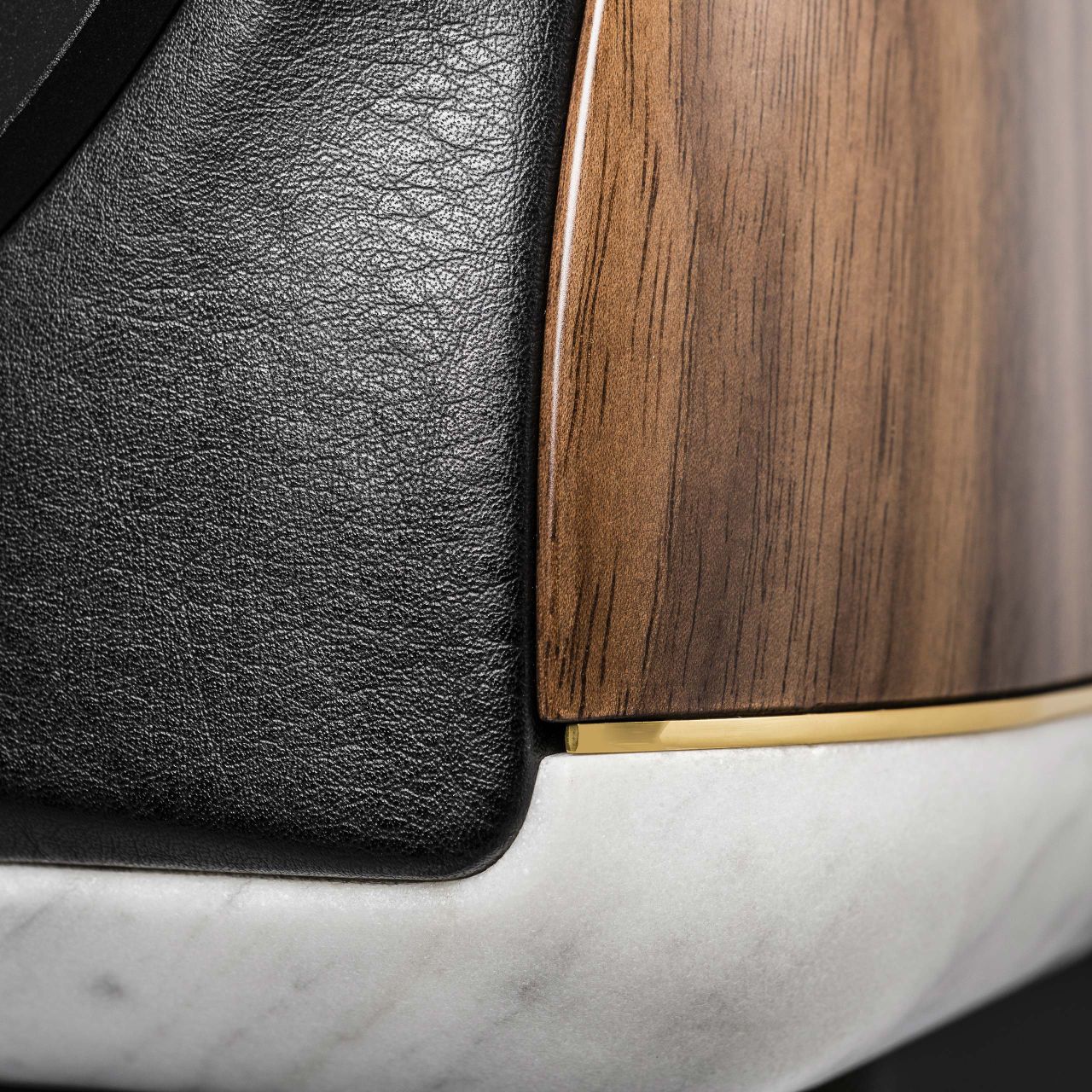The solid walnut wood of the cabinet delivers the warm sounds that characterize our voice. It is harmoniously combined with the marble base through a metal insert that illuminates the lines and enhances each material. Hand-applied leather envelopes the rear panel and front baffle.